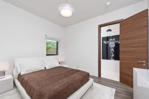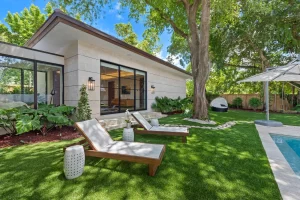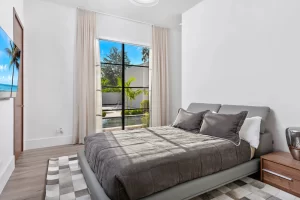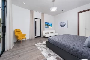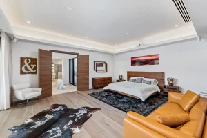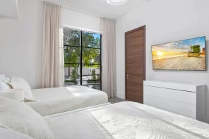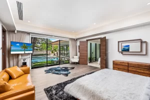 The single-level home features 6 bedrooms and gym for a quick work out before you start your day. The master suite with king bed overlooks the pool and includes an ample ensuite bathroom. The bedroom arrangements are perfect for families, business travelers, and groups of friends seeking extra privacy.